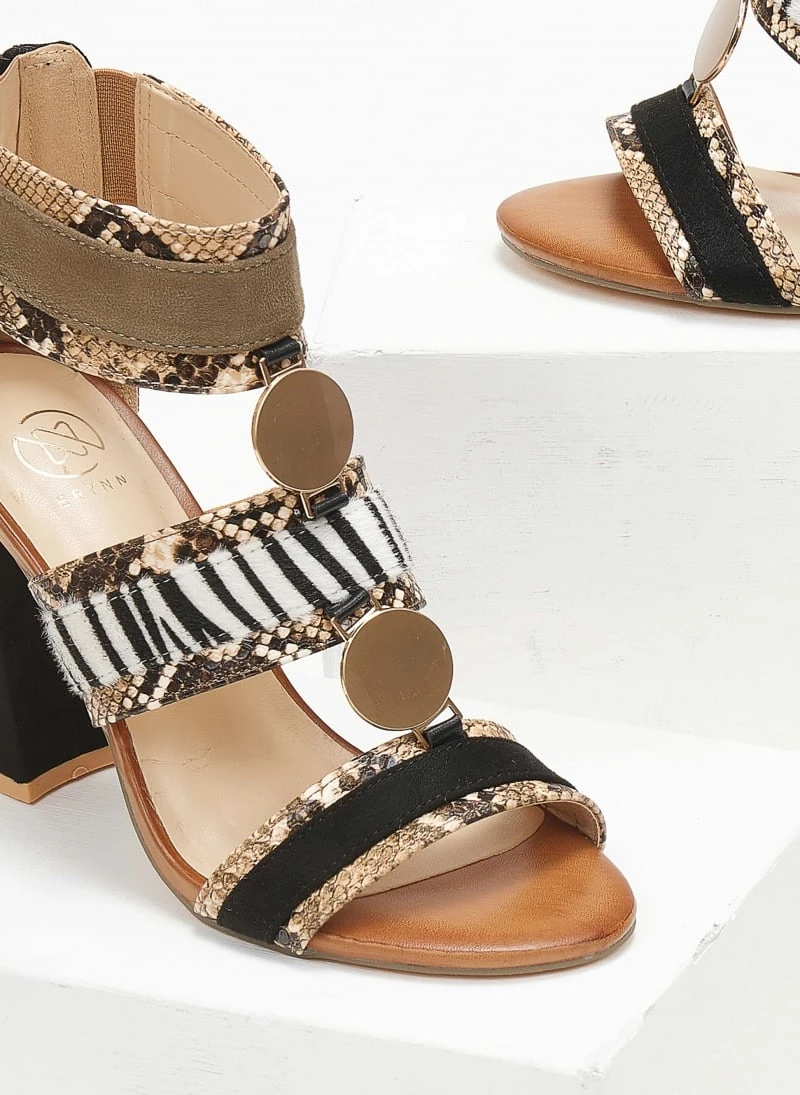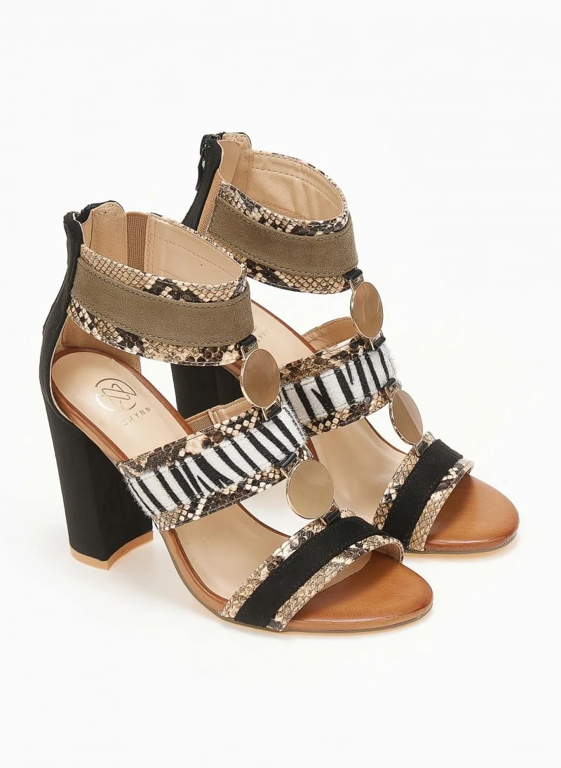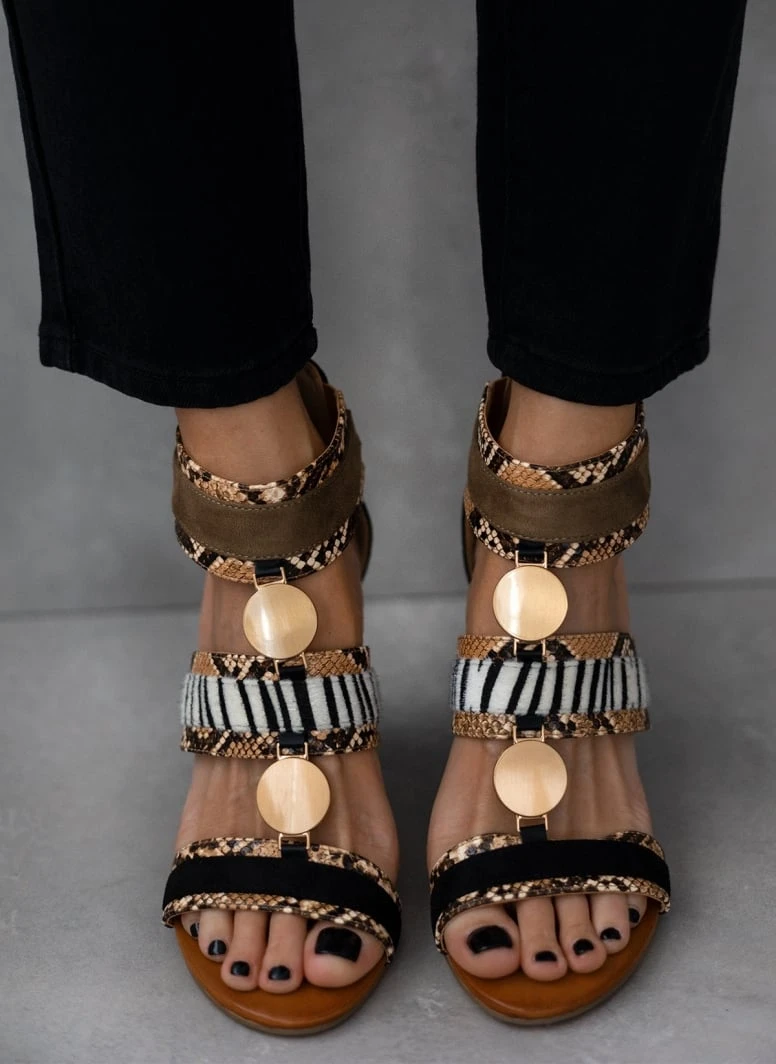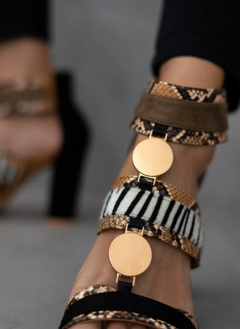 Πέδιλα suede με animal print λεπτομέρειες. Έχουν στρογγυλά μεταλλικά στοιχεία. Κλείνουν με φερμουάρ στο πίσω μέρος.