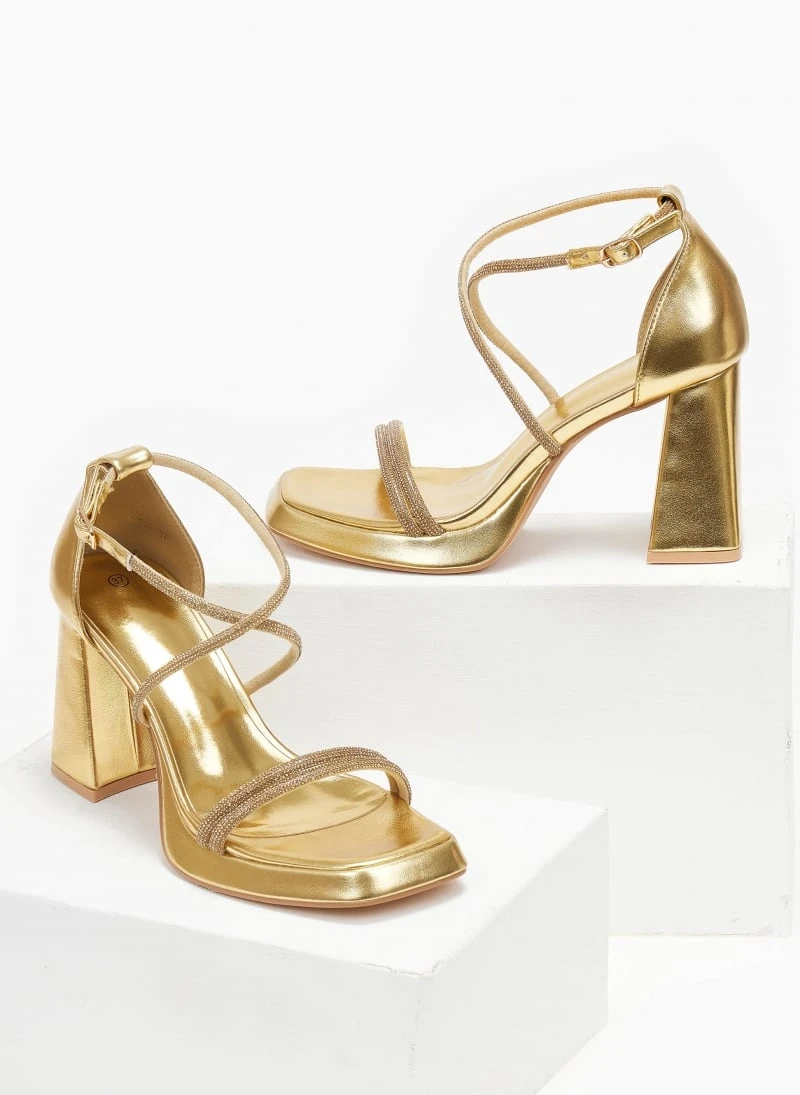 Πέδιλα με strass λουράκια. Έχουν ψηλό τακούνι καμπάνα και φιάπα. Καρέ γραμμή. Δένουν στο πλάι. Κλειστή φτέρνα.