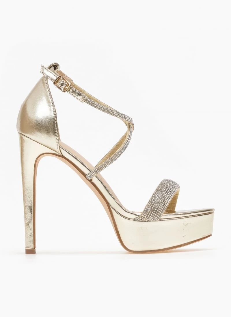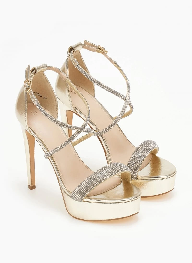 Πέδιλα με strass λουράκια. Έχουν φιάπα και ψηλό τακούνι. Δένουν με χιαστί λουράκια στο ύψος του αστραγάλου. Έχουν κλειστή φτέρνα. Μαλακός πάτος.