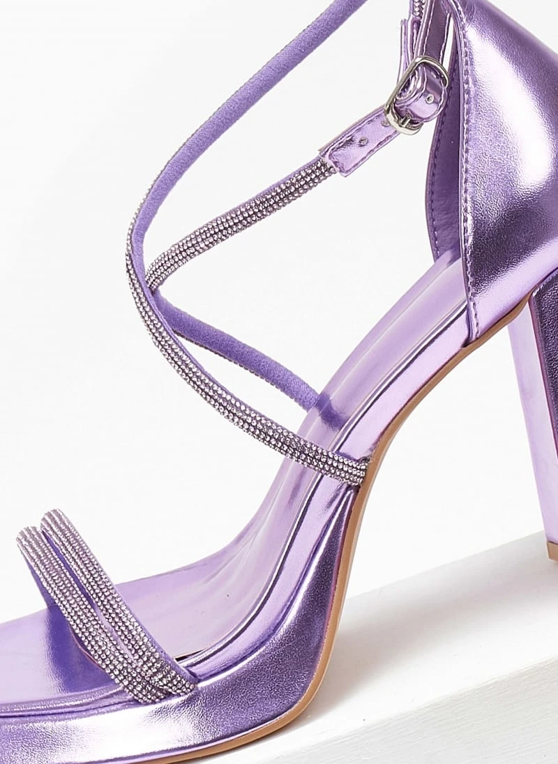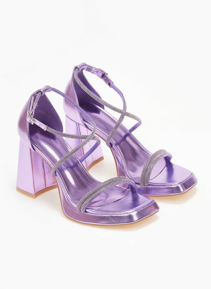 Πέδιλα με strass λουράκια. Έχουν ψηλό τακούνι καμπάνα και φιάπα. Καρέ γραμμή. Δένουν στο πλάι. Κλειστή φτέρνα.