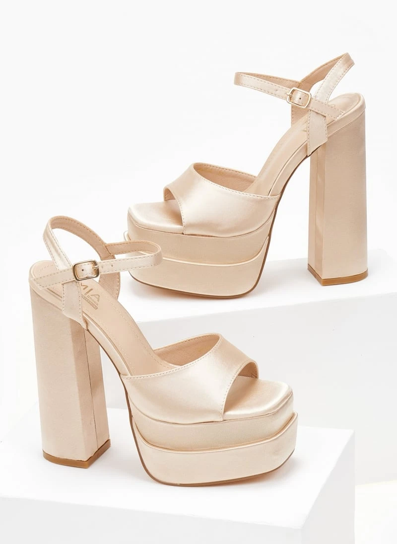 Πέδιλα platform σατέν. Δένουν με μπαρέτα στο ύψος του αστραγάλου. Καρέ γραμμή.