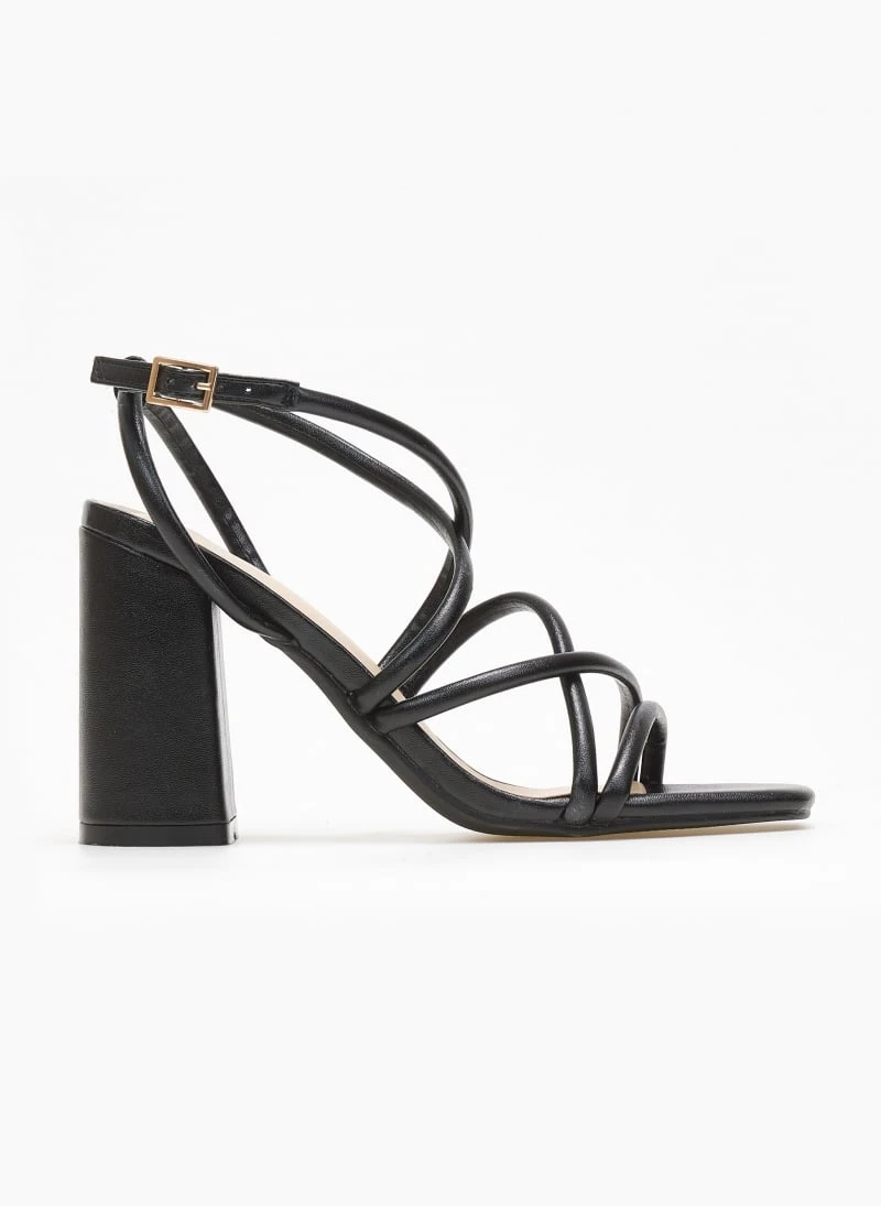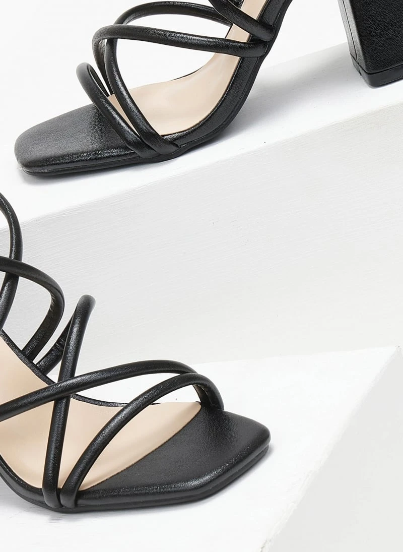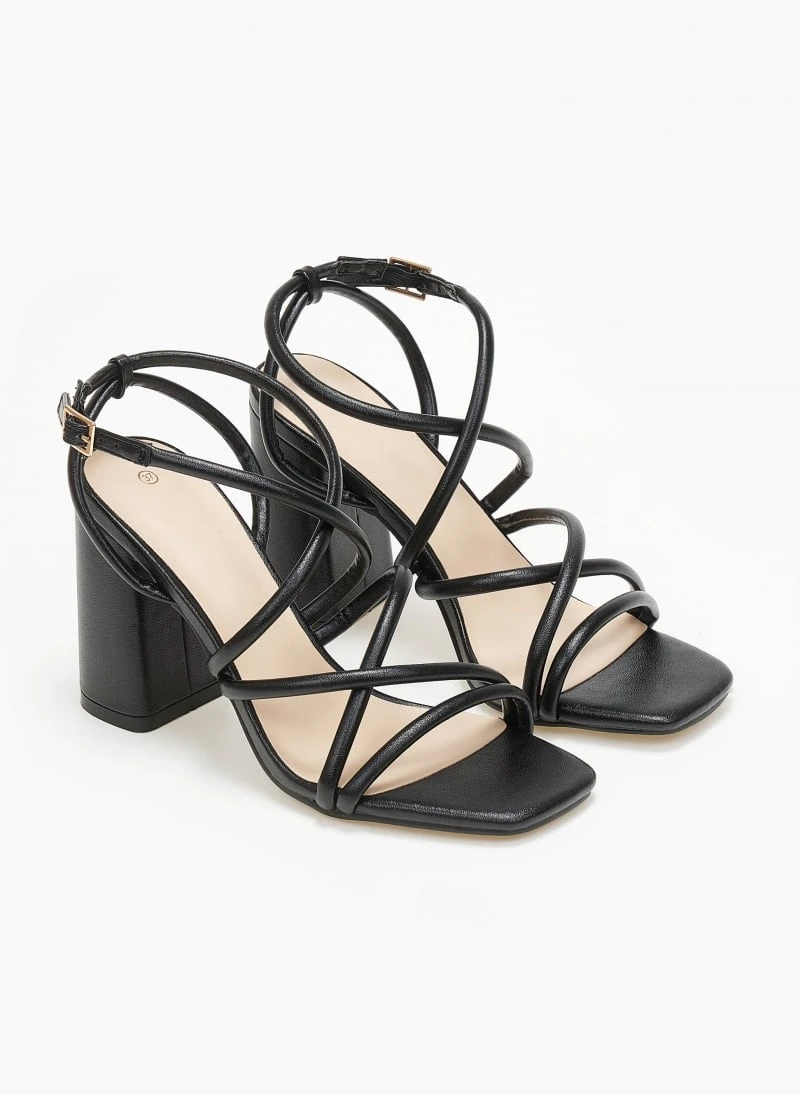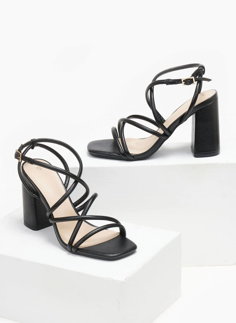 Πέδιλα σε μεταλλικά χρώματα. Έχουν ψηλό χοντρό τακούνι. Σχέδιο με λεπτά λουράκια χιαστί. Δένουν στο πλάι. Καρέ γραμμή.