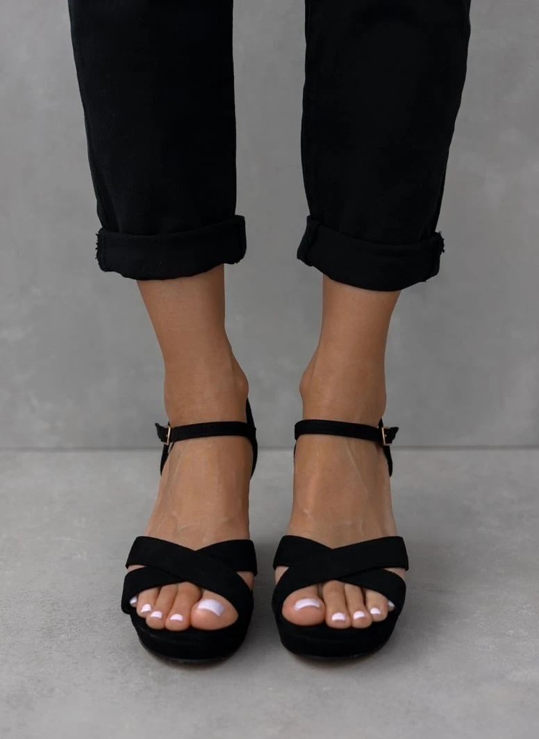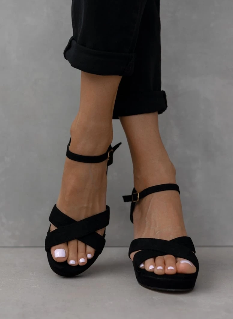 Πέδιλα suede με φάσες χιαστί. Έχουν φιάπα και χοντρό τακούνι. Δένουν με μπαρέτα στο ύψος του κουτεπιέ.