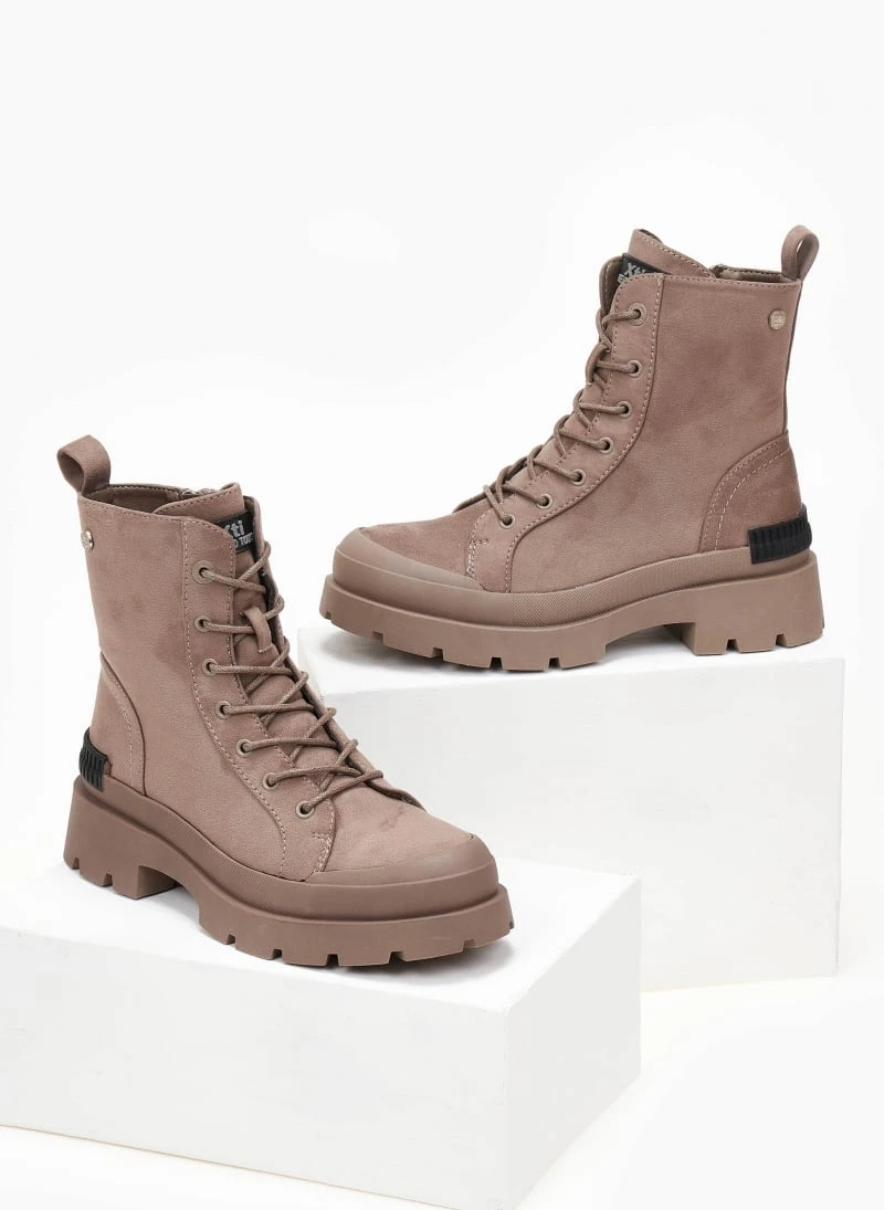 Xti μποτάκια casual με κορδόνια. Έχουν ψηλή chunky σόλα. Διακριτικό μεταλλικό στοιχείο στο πλάι. Θηλάκι στο πίσω μέρος. Peta-Vegan approved