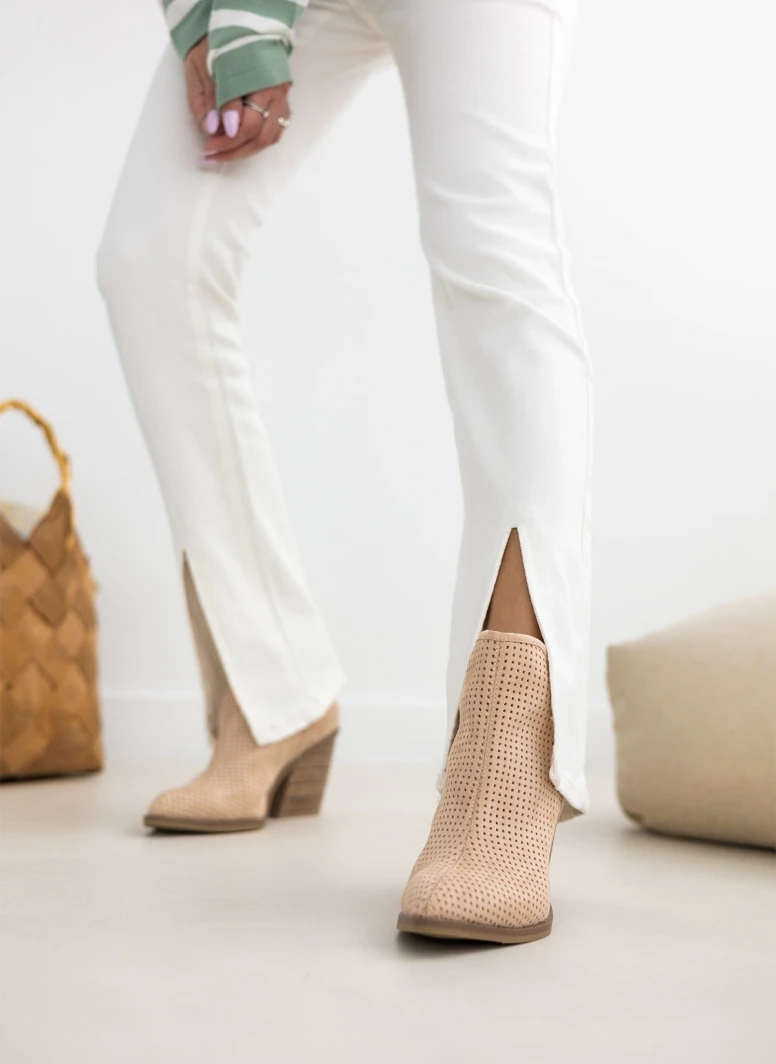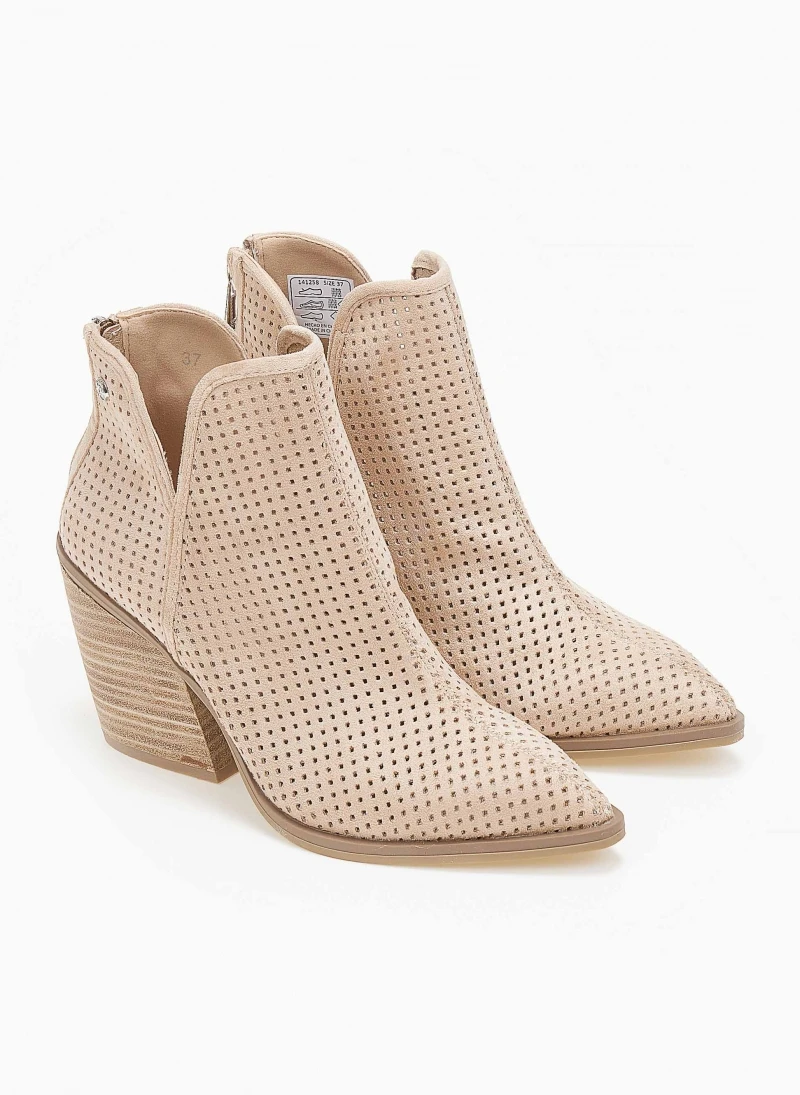 Μποτάκια cowboy suede Xti. Έχουν διάτρητο σχέδιο και ανοίγματα στο πλάι. Ξύλινο τακούνι. Μυτερή φόρμα. Κλείνουν με φερμουάρ στο πίσω μέρος.