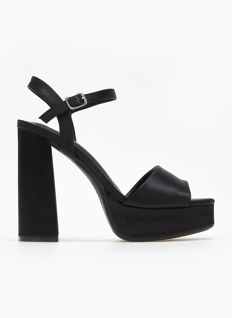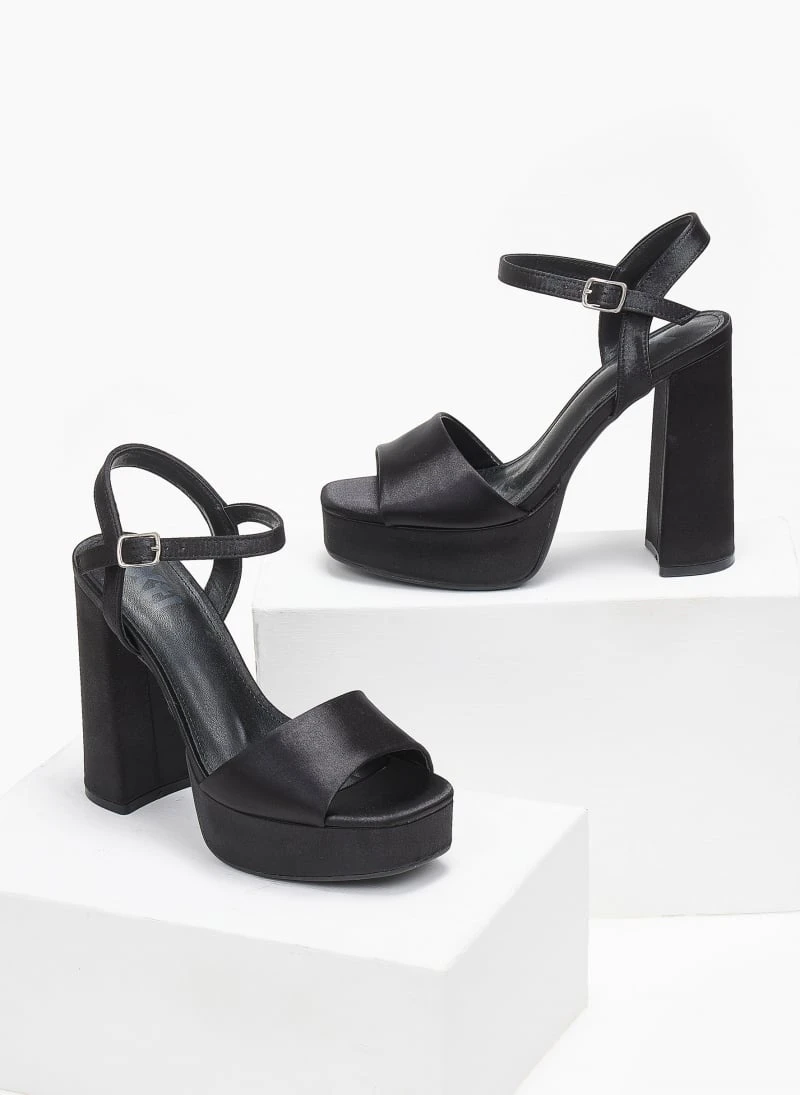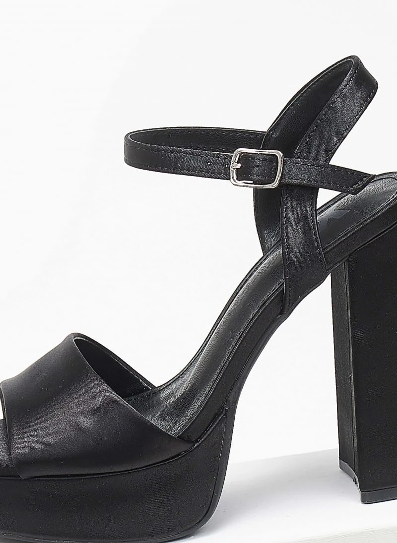 Πέδιλα σατέν XtI. Έχουν φαρδιά φάσα. Ψηλό τακούνι και φιάπα. Δένουν με μπαρέτα στο ύψος του κουτεπιέ. Peta vegan approved.