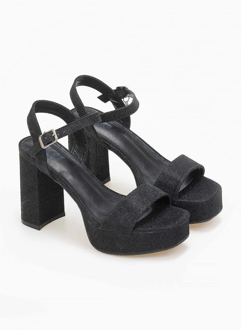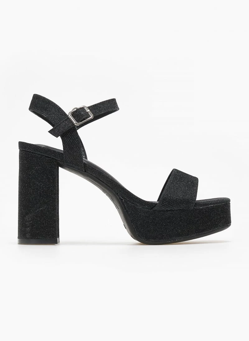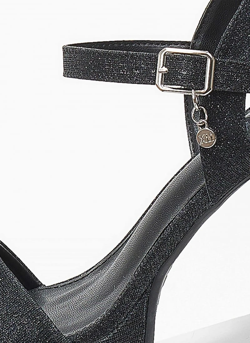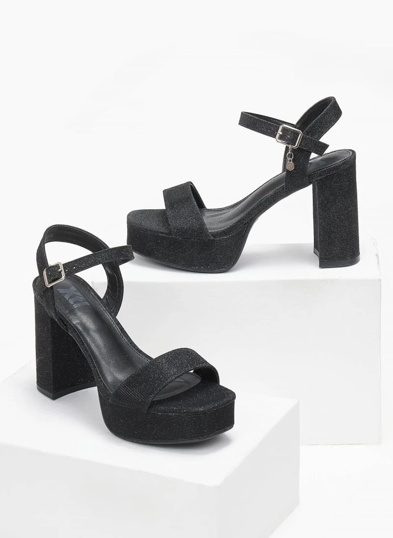 Πέδιλα από glitter ύφασμα Xti. Δένουν με μπαρέτα στο ύψος του αστραγάλου. Έχουν ψηλό χοντρό τακούνι και φιάπα. Καρέ γραμμή. Peta vegan approved.