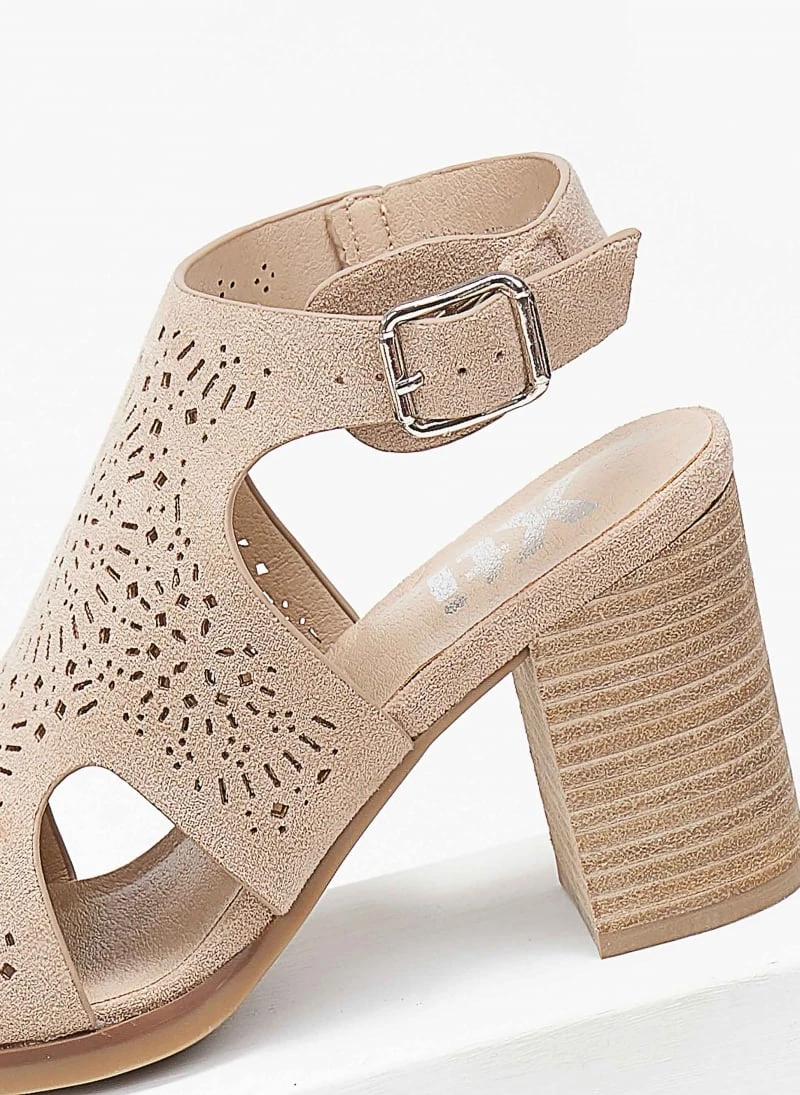 Πέδιλα χωστά suede Xti. Έχουν διάτρητο σχέδιο με ανοίγματα στο πλάι. Ξύλινο τακούνι. Peta vegan approved.